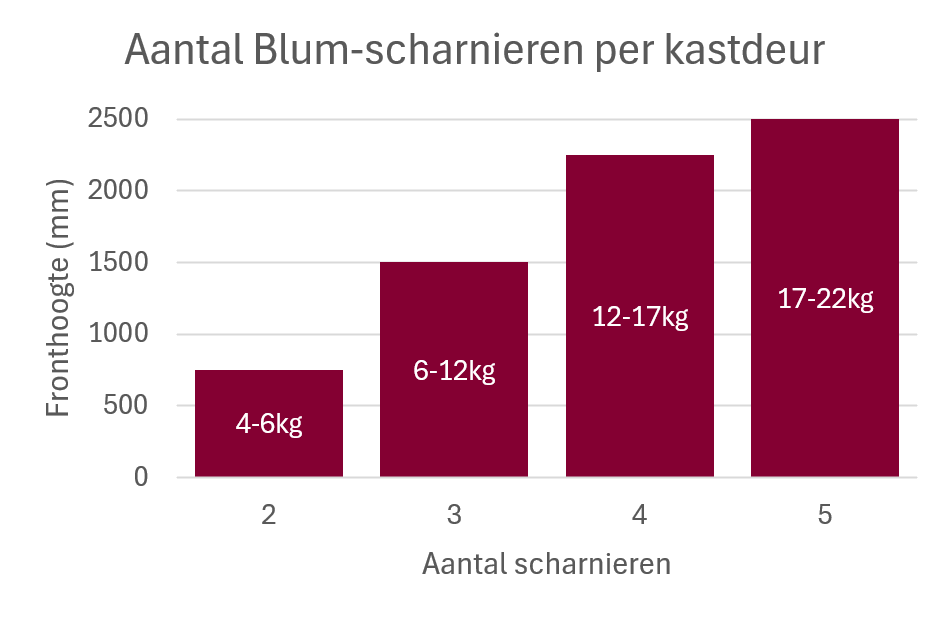 Hoeveel scharnieren je nodig hebt bij de montage van je kastdeur, is afhankelijk van het gewicht en de hoogte van de kast. In onderstaande grafiek zie je snel en eenvoudig hoeveel scharnieren je nodig hebt.