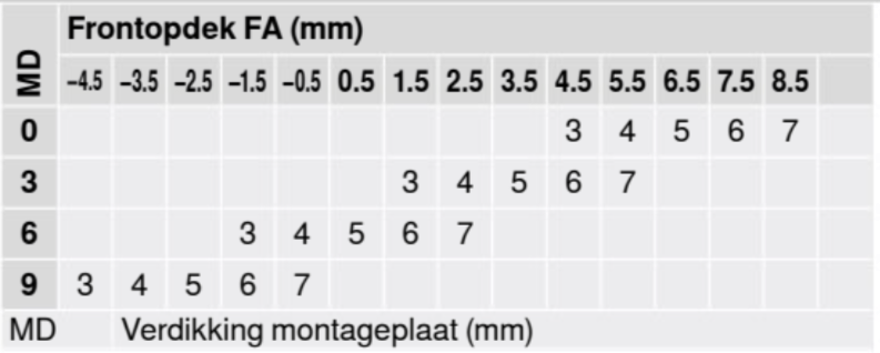 De verdikking van de montageplaat bij opliggende scharnieren van Blum, is afhankelijk van het frontopdek (zie afbeelding). Dit is de afstand hoe ver de kastdeur voor de zijwand ligt. Zodra je deze weet, kun je in onderstaande afbeelding vinden welke verdikking (MD) er bij deze frontopdekmaat past, en welke boormaat je hiervoor dient te gebruiken.