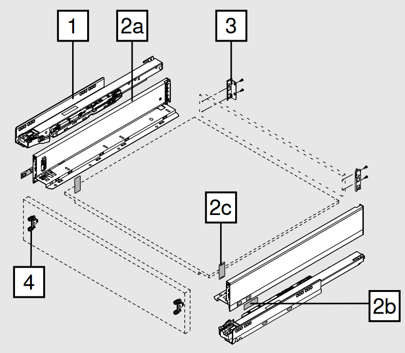 De Blum Legrabox wordt bij MeubelbeslagXXL standaard geleverd als complete set voor de lade, zonder front, achterwand en bodem. Hierbij zijn de volgende onderdelen inbegrepen: