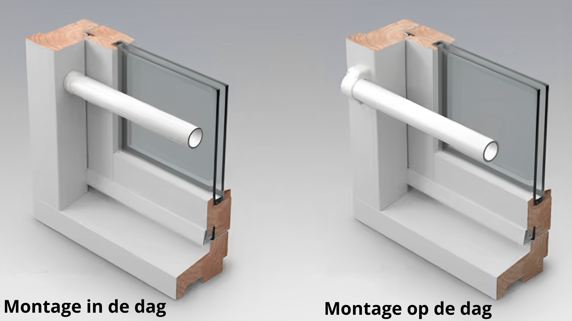 Op de dag betekent dat de steunen vóór het bouwdeel op het oppervlak worden gemonteerd, bijvoorbeeld tegen de voorzijde van de muur of het kozijn. Dit is vaak eenvoudiger te installeren en geschikt wanneer er geen diepe nis aanwezig is of als montage-in-het-vlak niet gewenst is.