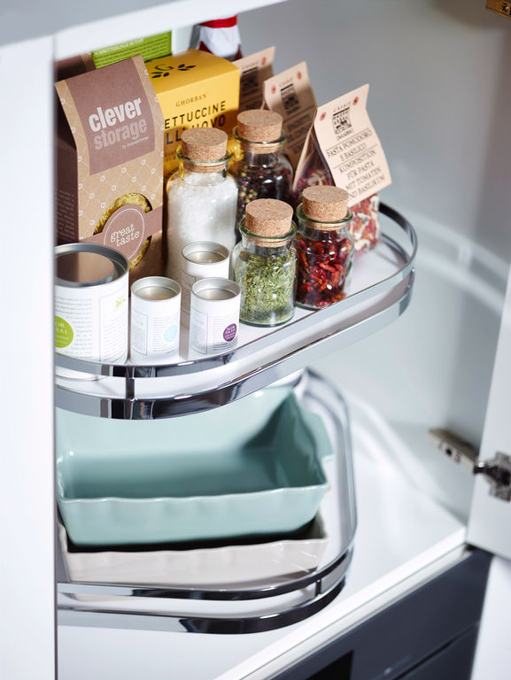 Kesseböhmer Turnmotion II is een zeer handig draaiplateau voor bovenkasten in bijvoorbeeld de keuken. Door het draaiplateau is het namelijk mogelijk om gemakkelijk de achterste producten te pakken in de kast.