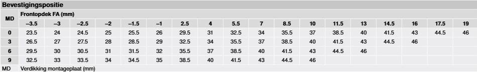 Wil je een frontopdek van 7 mm (FA), dan gebruik je een 0 mm montageplaat (MD) en een bevestigingspositie van 34 mm (B).